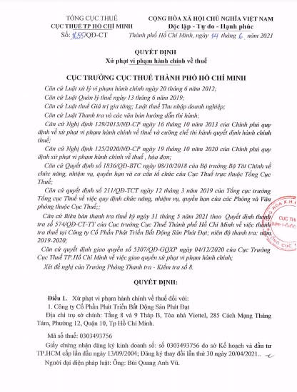 Cụ thể, Ngày 14/6/2021 Cục thuế TP Hồ Chí Minh đã có Quyết định số 1655/QĐ-CT để xử phạt vi phạm hành chính về thuế đối với Công ty Cổ phần Phát triển BĐS Phát Đạt (Gọi tắt là Công ty Phát Đạt) có trụ sở tại tầng 8 và 9 – Tháp B, Tòa nhà Viettel, số 285 Cách Mạng Tháng 8, P.12, Q.10, TP.HCM.