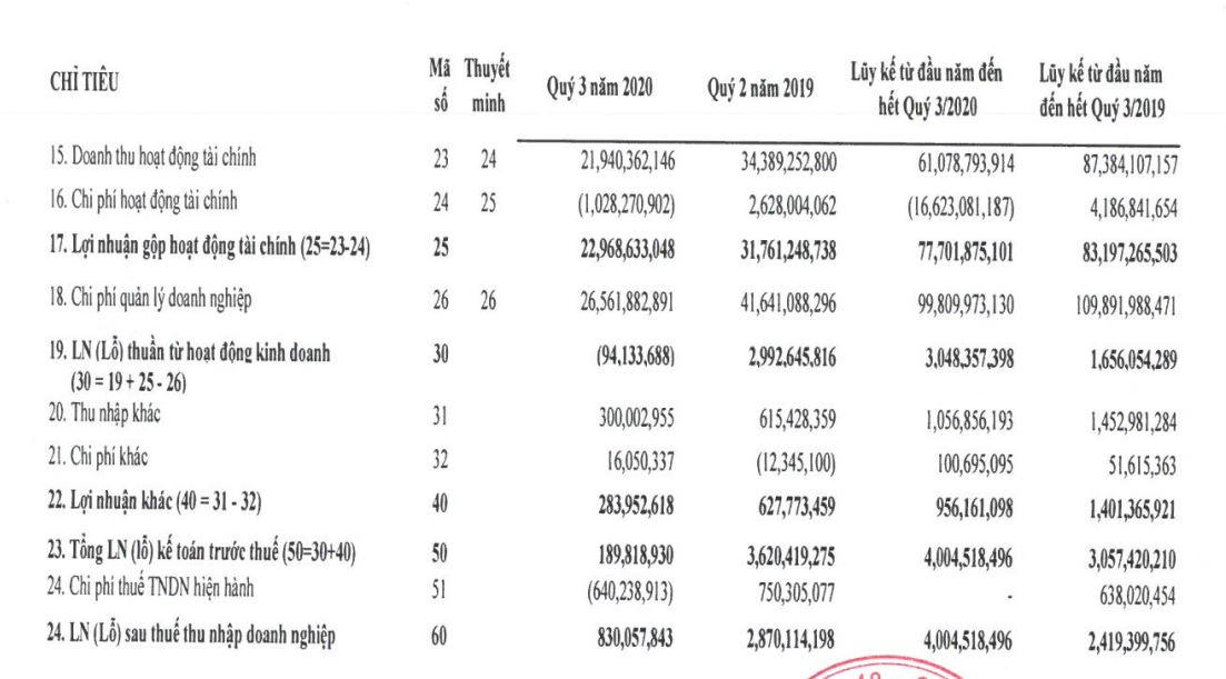 Tính đến cuối quý 3/2020, dòng tiền thuần từ hoạt động kinh doanh dương gần 116 tỷ đồng, tuy nhiên con số này đã giảm 50% so với cùng kỳ. Trong đó, dòng tiền thuần từ hoạt động kinh doanh riêng quý 3/2020 âm hơn 59 tỷ đồng dù cùng kỳ năm ngoái chỉ âm 3,5 tỷ đồng do tiền chi cho hoạt động kinh doanh bảo hiểm tăng mạnh.