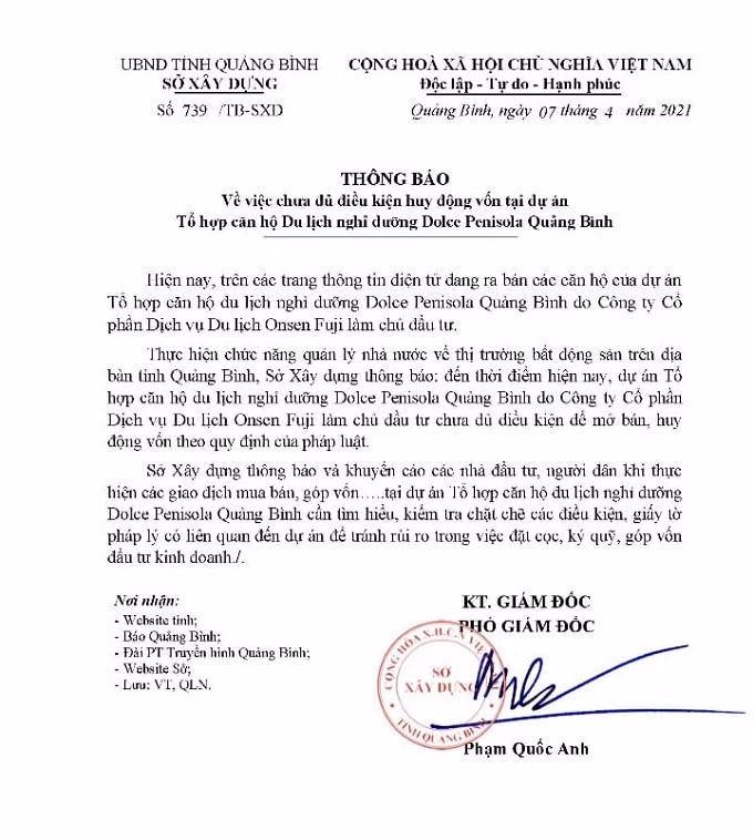 Trước thực trạng đó, Sở Xây dựng Quảng Bình đã có văn bản số 739/TB - SXD về việc chưa đủ điều kiện huy động vốn tại Dự án Tổ hợp căn hộ Du lịch nghỉ dưỡng Dolce Penisola Quảng Bình.