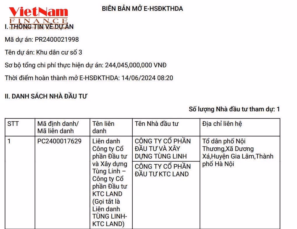 Sở Kế hoạch và Đầu tư Thái Nguyên vừa mở hồ sơ đăng ký thực hiện Dự án Khu dân cư số 3 tại thị trấn Hương Sơn, huyện Phú Bình. Nhà đầu tư duy nhất đăng ký thực hiện dự án là Liên danh Công ty cổ phần Đầu tư và xây dựng Tùng Linh - Công ty cổ phần Đầu tư KTC Land.