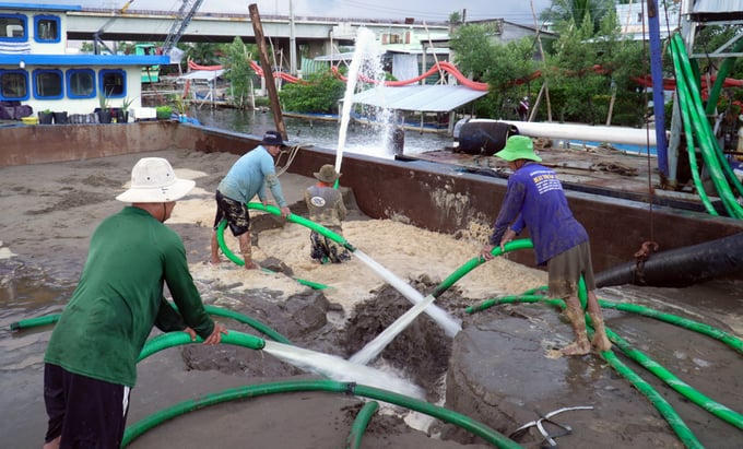 Theo chia sẻ của Giám đốc Ban điều hành XL02 (đoạn Thới Bình, Cà Mau) - ông Phạm Văn Dự cho biết cát được khai thác ở cửa biển thuộc huyện Sóc Trăng, sau đó được bơm lên sà lan và chuyển về dự án, thời gian đưa cát về dự án mất hơn 24h.