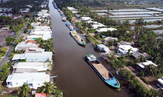 Hàng chục ghe cát biển và sông xếp hàng dài chờ đợi tại kênh Xáng Huyện Sử (huyện Thới Bình) vào chiều 10/7, chờ được bơm lên công trình cao tốc.