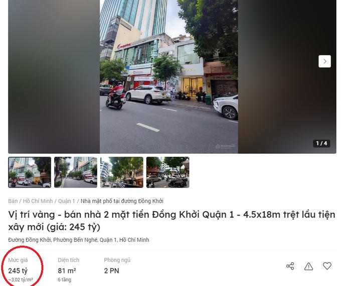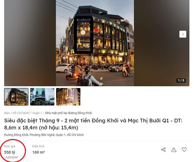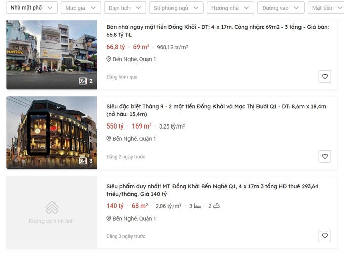 Đơn cử như một căn nhà 2 mặt tiền trên đường Đồng Khởi đang được rao trên kênh Batdongan.com.vn có diện tích 81m2 với 5 tầng và được giới thiệu có thể cho thuê với giá 200-250 triệu đồng/tháng đang được chào bán với giá 245 tỷ đồng, tương đương 3,02 tỷ đồng/m2. Hay mức giá "khủng" hơn nữa là một căn nhà khác có diện tích 169m2, tọa lạc tại giao lộ Đồng Khởi - Mạc Thị Bưởi hiện được rao bán với giá 550 tỷ đồng, tương đương 3,25 tỷ đồng/m2.