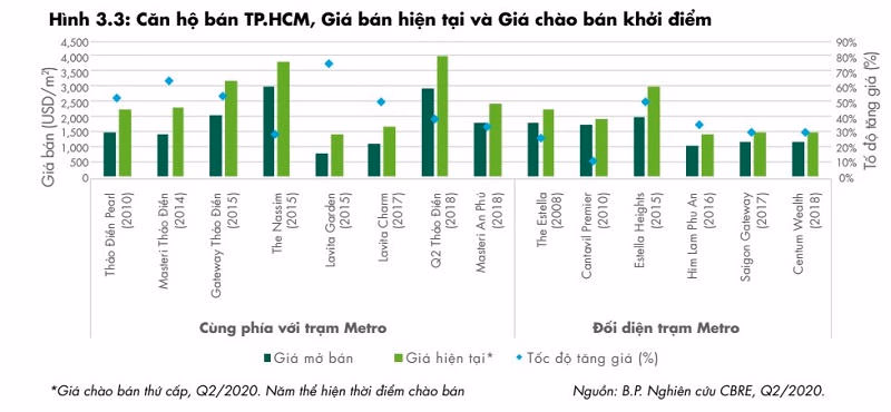 Dữ liệu của CBRE cho thấy tốc độ tăng giá tại thành phố Thủ Đức, đặc biệt là quận 2 (cũ), bắt đầu tăng nhanh từ khi tuyến metro số 1 được đẩy mạnh xây dựng từ 2015, với số lượng căn bán ra tăng gấp bốn lần so với giai đoạn 2010-2014.