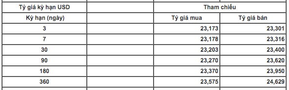 Tại kỳ hạn 30 ngày,giá USD đang ở mức 23.203 - 23.400 VND/USD, tại kỳ hạn 90 ngày, tỷ giá là 23.270 - 23.620 đồng, tại kỳ hạn 360 ngày, giá USD đang là 23.575 - 24.629 VND/USD, giảm 1 đồng ở mỗi chiều.