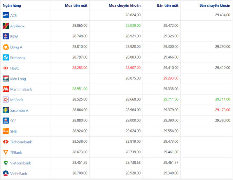 Ở bảng so sánh tỷ giá bên trên, giá trị màu xanh sẽ tương ứng với giá cao nhất; màu đỏ tương ứng với giá thấp nhất trong cột.