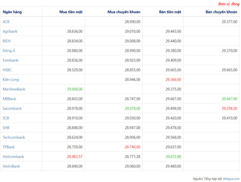 Ở bảng so sánh tỷ giá bên trên, giá trị màu xanh sẽ tương ứng với giá cao nhất; màu đỏ tương ứng với giá thấp nhất trong cột.