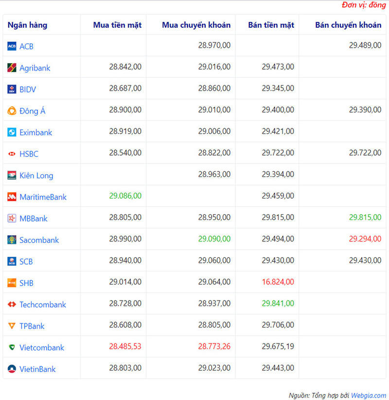Ở bảng so sánh tỷ giá bên trên, giá trị màu xanh sẽ tương ứng với giá cao nhất; màu đỏ tương ứng với giá thấp nhất trong cột.