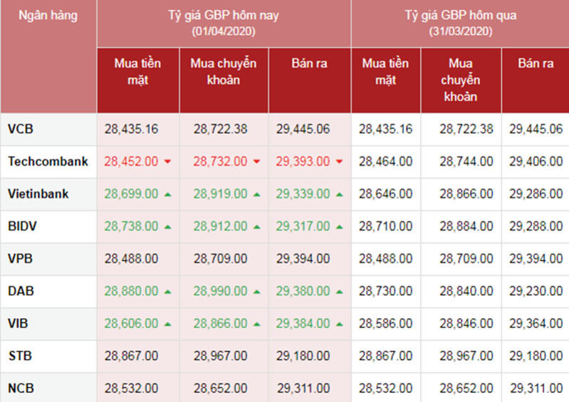 * Mũi tên màu đỏ: thể hiện tỷ giá đang xem thấp hơn so với ngày trước đó.