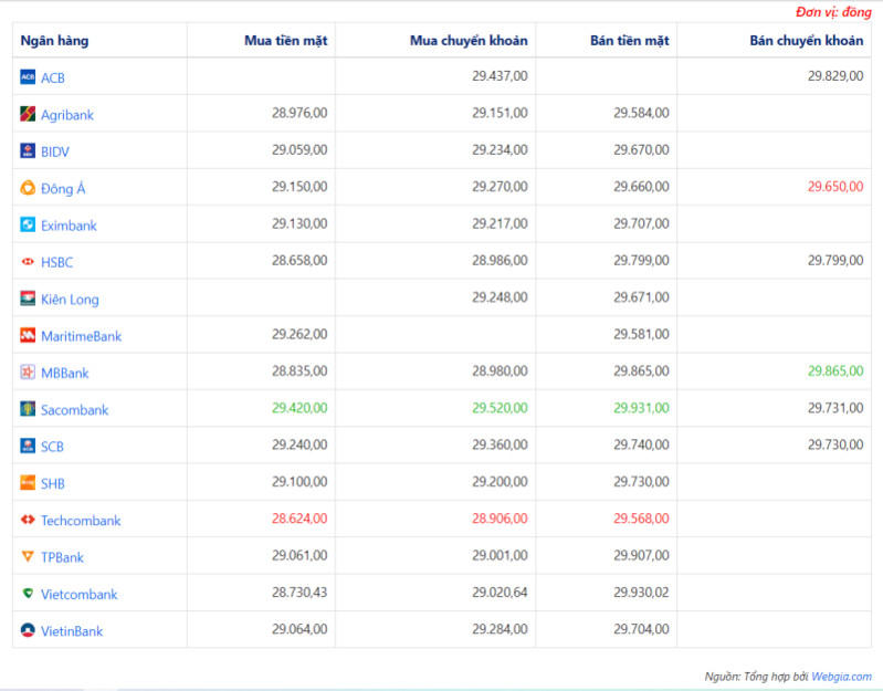 Ở bảng so sánh tỷ giá bên trên, giá trị màu xanh sẽ tương ứng với giá cao nhất; màu đỏ tương ứng với giá thấp nhất trong cột.