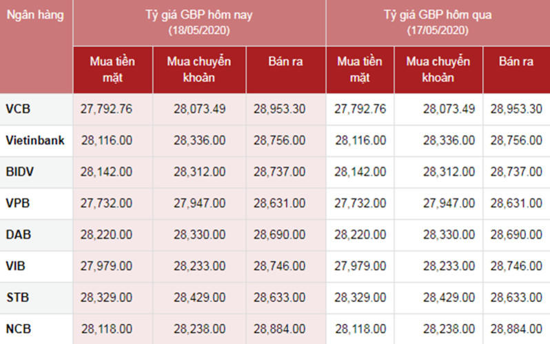 Hôm nay Ngân hàng Sacombank mua Bảng Anh (GBP) giá cao nhất là 28,329.00 VNĐ/GBP. Bán Bảng Anh (GBP) thấp nhất là Ngân hàng Việt Nam Thịnh Vượng với 28,631.00 VNĐ một GBP.