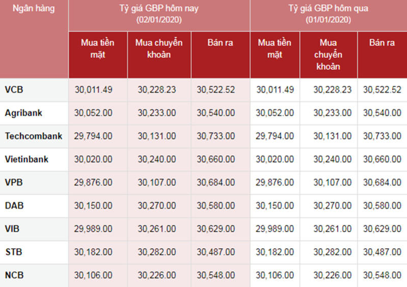 Bảng Tỷ giá GBP so sánh 2 ngày 1/1/2019 và 2/1/2019. Nguồn: ngan-hang.com. |