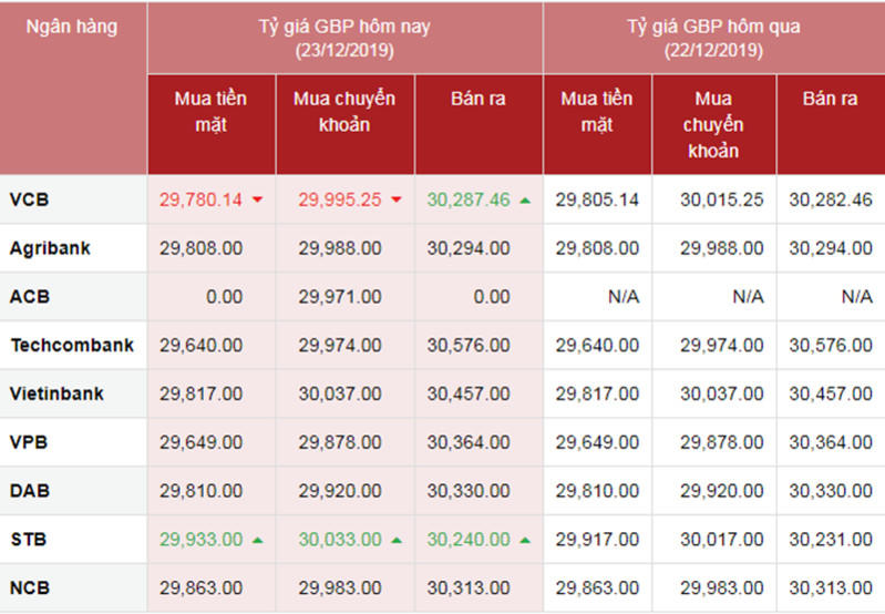 Bảng Tỷ giá GBP so sánh 2 ngày 22/12/2019 và 23/12/2019. Nguồn: ngan-hang.com. |