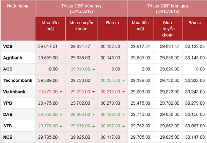 Bảng Tỷ giá GBP so sánh 2 ngày 24/12/2019 và 25/12/2019. Nguồn: ngan-hang.com. |