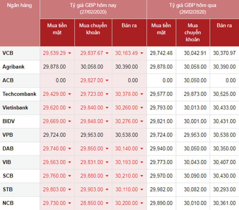 Bảng Tỷ giá GBP so sánh 2 ngày 26/2/2019 và 27/2/2019. Nguồn: ngan-hang.com