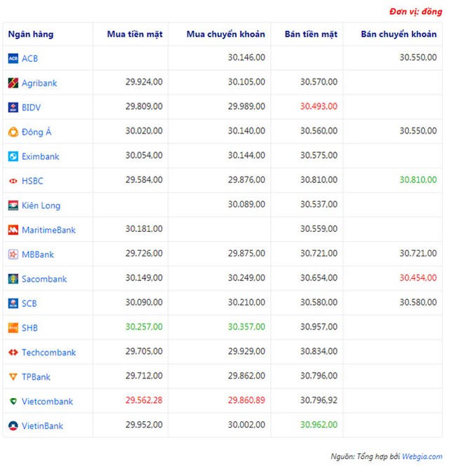 Ở bảng so sánh tỷ giá bên trên, giá trị màu xanh sẽ tương ứng với giá cao nhất; màu đỏ tương ứng với giá thấp nhất trong cột.