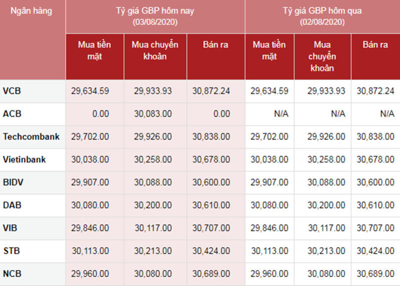 Bảng Tỷ giá GBP so sánh 2 ngày 2/8/2019 và 3/8/2019. Nguồn: ngan-hang.com.