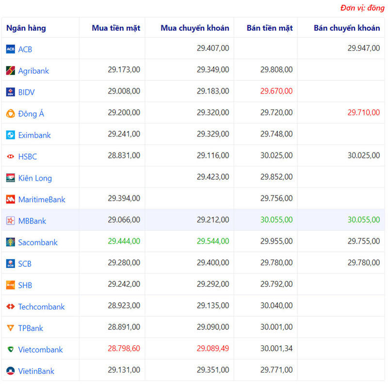 Ở bảng so sánh tỷ giá bên trên, giá trị màu xanh sẽ tương ứng với giá cao nhất; màu đỏ tương ứng với giá thấp nhất trong cột.