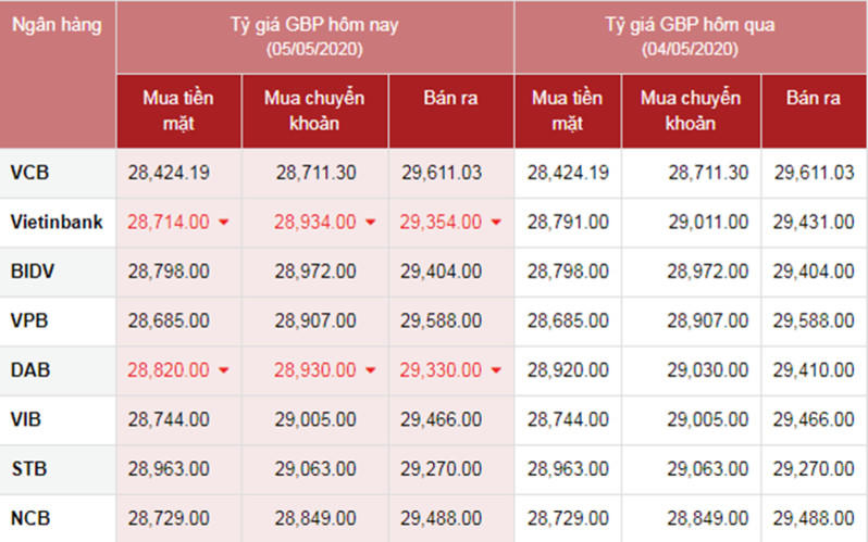 Bảng Tỷ giá GBP so sánh 2 ngày 4/5/2019 và 5/5/2019. Nguồn: ngan-hang.com