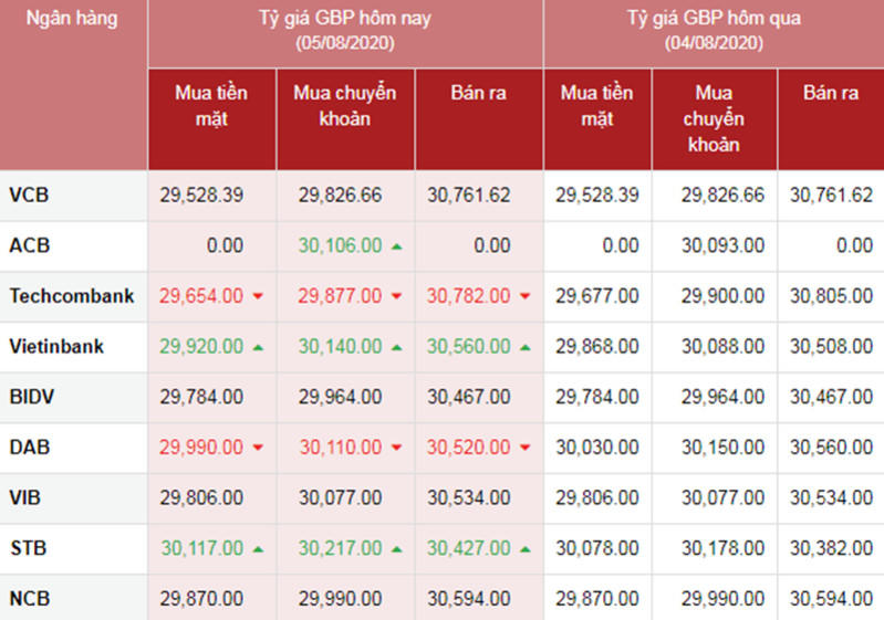 Bảng Tỷ giá GBP so sánh 2 ngày 4/8/2019 và 5/8/2019. Nguồn: ngan-hang.com