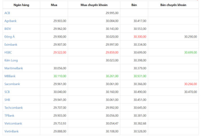Ở bảng so sánh tỷ giá bên dưới, giá trị màu xanh sẽ tương ứng với giá cao nhất; màu đỏ tương ứng với giá thấp nhất trong cột.