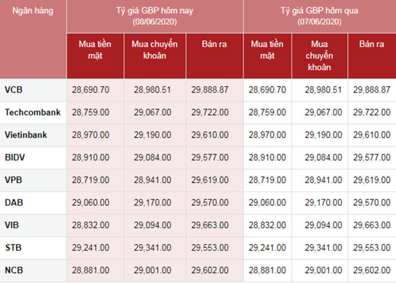 Bảng Tỷ giá GBP so sánh 2 ngày 7/6/2019 và 8/6/2019. Nguồn: ngan-hang.com.