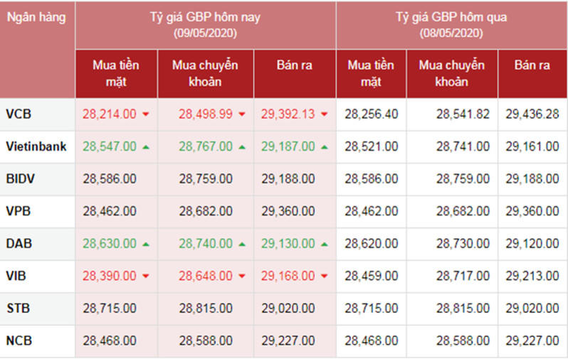 Bảng Tỷ giá GBP so sánh 2 ngày 8/5/2019 và 9/5/2019. Nguồn: ngan-hang.com