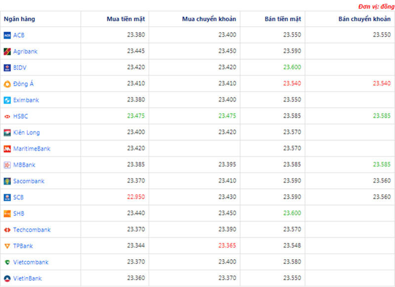 + Ngân hàng HSBC, MBBank đang bán chuyển khoản USD với giá cao nhất là: 1 USD = 23.585 VND