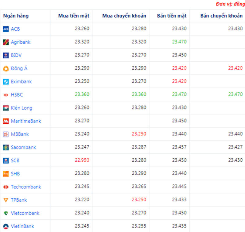 + Ngân hàng MBBank, TPBank đang mua chuyển khoản USD với giá thấp nhất là: 1 USD = 23.250 VND