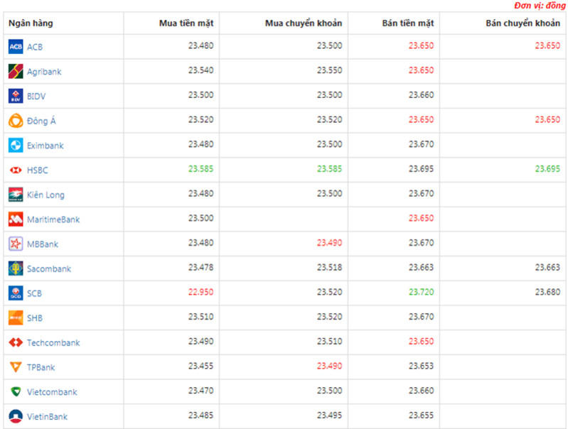 + Ngân hàng MBBank, TPBank đang mua chuyển khoản USD với giá thấp nhất là: 23.490 vnđ / 1 USD