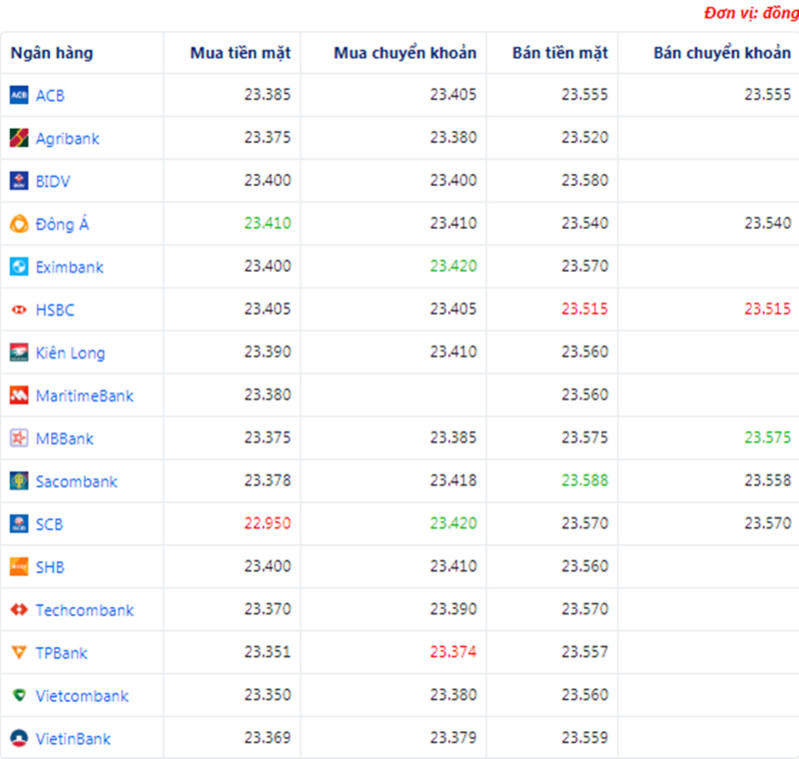 Tới cuối phiên 22/4, Vietcombank niêm yết tỷ giá ở mức: 23.380 đồng/USD và 23.560 đồng/USD. Vietinbank: 23.379 đồng/USD và 23.559 đồng/USD. BIDV: 23.400 đồng/USD và 23.580. ACB: 23.405 đồng/USD và 23.555 đồng/USD.