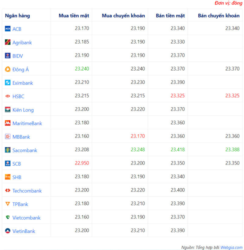 + Ngân hàng Sacombank đang mua chuyển khoản USD với giá cao nhất là: 1 USD = 23.248 VND