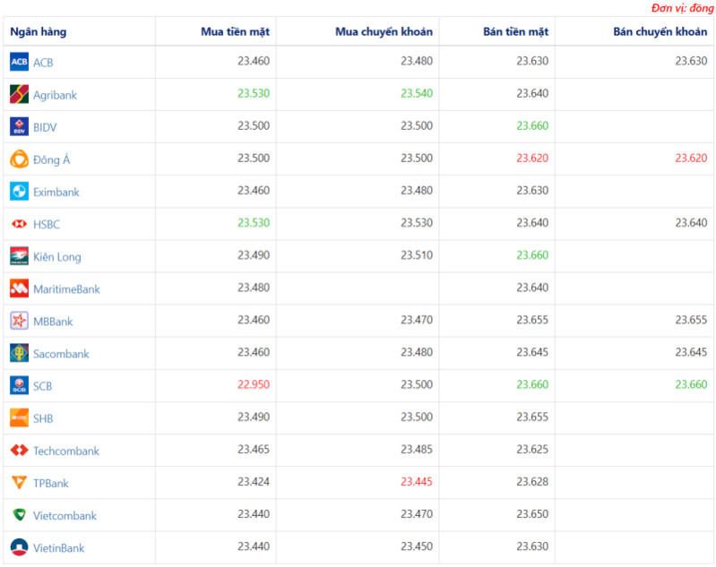 Vietcombank niêm yết ở mức: 23.490 đồng (mua) và 23.650 đồng (bán). BIDV: 23.500 đồng (mua) và 23.660 đồng (bán). Vietinbank: 23.410 đồng (mua) và 23.650 đồng (bán). ACB: 23.500 đồng (mua) và 23.650 đồng (bán).