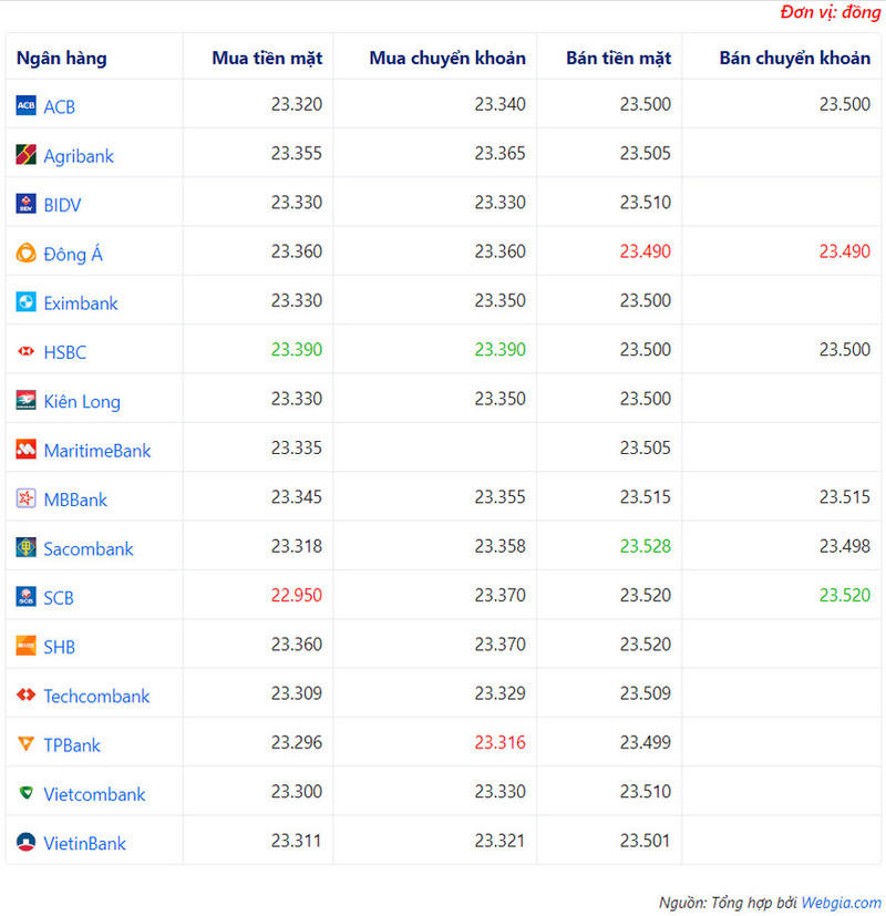 Vietcombank và BIDV niêm yết tỷ giá ở mức: 23.355 đồng/USD và 23.535 đồng/USD. Vietinbank: 23.330 đồng/USD và 23.510 đồng/USD. ACB: 23.370 đồng/USD và 23.520 đồng/USD.