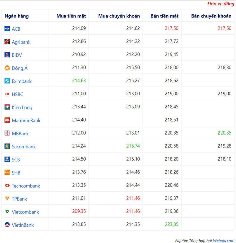 + Ngân hàng Sacombank đang mua chuyển khoản JPY với giá cao nhất là: 1 JPY = 215,74 VND