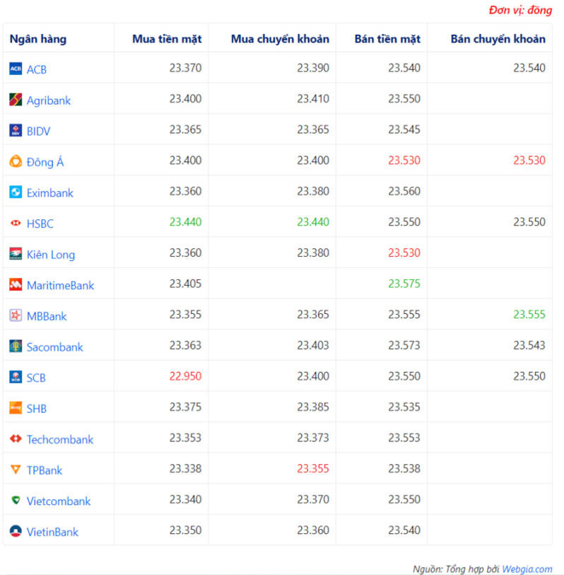 + Ngân hàng TPBank đang mua chuyển khoản USD với giá thấp nhất là: 1 USD = 23.355 VND