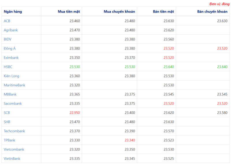 + Ngân hàng HSBC đang bán chuyển khoản USD với giá cao nhất là: 1 USD = 23.640 VND