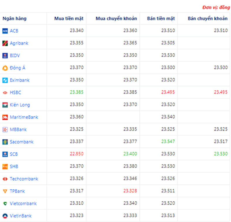 + Ngân hàng HSBC đang bán chuyển khoản USD với giá thấp nhất là: 1 USD = 23.495 VND