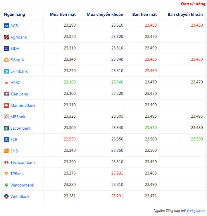 + Ngân hàng TPBank, VietinBank đang mua chuyển khoản USD với giá thấp nhất là: 1 USD = 23.291 VND