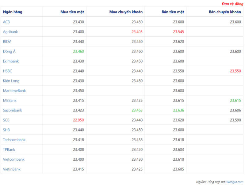 + Ngân hàng Sacombank đang mua chuyển khoản USD với giá cao nhất là: 1 USD = 23.463 VND