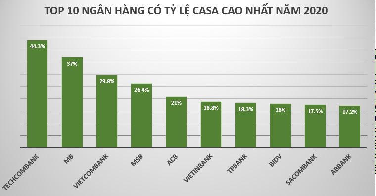 Vietcombank và MB là 2 ngân hàng đã quá quen thuộc khi nói đến việc có tỷ lệ tiền gửi không kỳ hạn (CASA) lớn nhất trong hệ thống. Tuy nhiên, năm 2020, cả MB và Vietcombank đều bị soán ngôi bởi Techcombank.