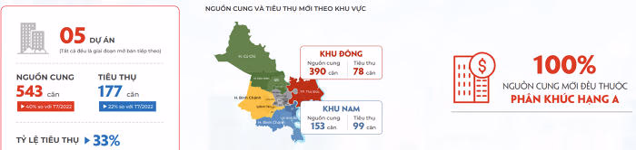 Theo thống kê, khu Đông (TP Thủ Đức) và khu Nam dẫn đầu thị trường trong tháng qua khi lần lượt chiếm 72% và 28% nguồn cung mới mở bán trong tháng. 100% sản phẩm mở bán mới thuộc phân khúc hạng A, trong khi các phân khúc còn lại hầu như không xuất hiện.