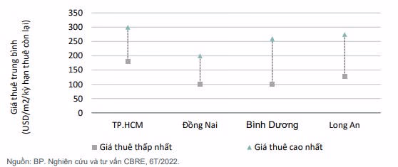 Theo đó, thị trường TP.HCM ghi nhận mức giá thuê trung bình cao nhất, dao động từ 180 - 300 USD/m2/chu kỳ thuê. Tiếp theo là thị trường Long An với mức giá thuê trung bình trong khoảng 125 - 275 USD/m2/chu kỳ thuê. Mức giá thuê khu công nghiệp trung bình ở Bình Dương là từ 100 - 250 USD/m2/chu kỳ thuê còn Đồng Nai có mức giá thuê trong khoảng 100 – 200 USD/m2/chu kỳ thuê.