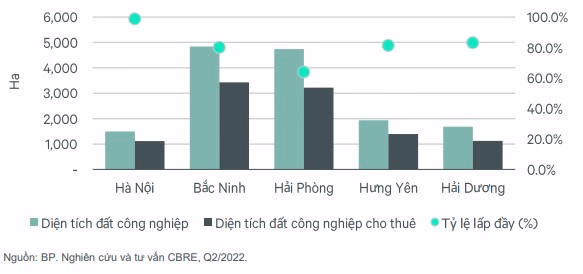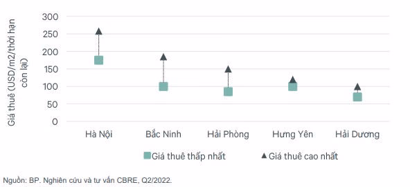 Trong vòng ba năm tới, nguồn cung đất công nghiệp sẽ tăng thêm hơn 14.000 ha cho cả hai thị trường lớn nhất cả nước. Một số khu công nghiệp chuẩn bị đi vào hoạt động trong nửa cuối 2022 và đầu năm 2023 đã đạt được tỷ lệ cam kết cho thuê sớm khả quan, ở ngưỡng từ 40% - 100% giai đoạn đầu triển khai. Với nguồn cầu khả quan, mức giá thuê đất công nghiệp dự kiến sẽ có mức tăng khả quan là khoảng 5-10%/năm trong ba năm tới tại thị trường phía Bắc. Theo các báo cáo cho thấy, giá cho thuê BĐS công nghiệp tại Thủ đô Hà Nội đang ở ngưỡng cao và được dự đoán sẽ còn tăng trưởng mạnh so với các tỉnh, thành còn lại trong khu vực phía Bắc, lên đến 250 USD/m2. Tuy nhiên, mức tăng trưởng chung của khu vực phía Bắc vẫn chưa đồng đều và chưa rõ nét.