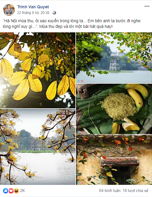 Đơn cử khi Hà Nội bước vào thu, trước sự thay đổi của đất trời, vị doanh nhân này đã đăng dòng trạng thái: “Hà Nội mùa thu, ôi xao xuyến trong lòng ta... Em bên anh ta bước đi nghe lòng nghĩ suy gì...”. Mùa thu đẹp và lời một bài hát quá hay!”. Kèm theo đó là những bức ảnh mang đậm chất mùa thu Hà Nội khiến bất cứ ai nhìn vào cũng phải xao xuyến.