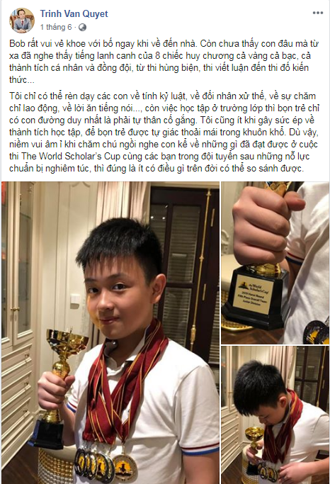 Hay như một bài chia sẻ về cậu con trai của mình: “Bob rất vui vẻ khoe với bố ngay khi về đến nhà. Còn chưa thấy con đâu mà từ xa đã nghe thấy tiếng lanh canh của 8 chiếc huy chương cả vàng cả bạc, cả thành tích cá nhân và đồng đội, từ thi hùng biện, thi viết luận đến thi đố kiến thức...