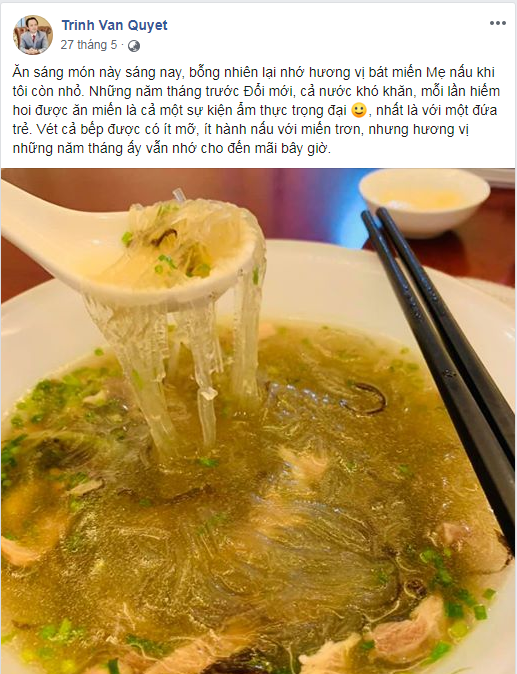Và một bữa ăn sáng cũng khiến vị doanh nhân này nhớ về những ngày thơ ấu: “Ăn sáng món này sáng nay, bỗng nhiên lại nhớ hương vị bát miến mẹ nấu khi tôi còn nhỏ. Những năm tháng trước đổi mới, cả nước khó khăn, mỗi lần hiếm hoi được ăn miến là cả một sự kiện ẩm thực trọng đại, nhất là với một đứa trẻ. Vét cả bếp được có ít mỡ, ít hành nấu với miến trơn, nhưng hương vị những năm tháng ấy vẫn nhớ cho đến mãi bây giờ.”