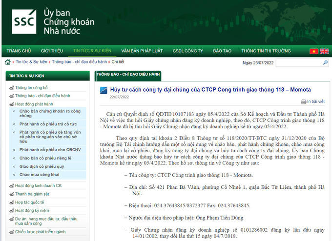 Hủy tư cách công ty đại chúng của CTCP Công trình giao thông 118 – Momota.