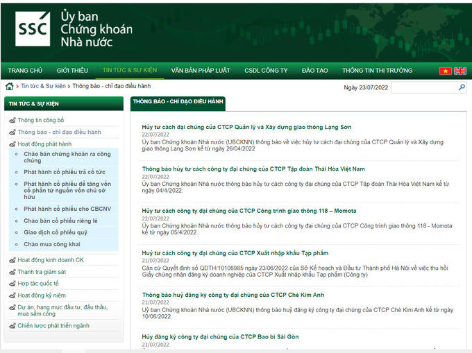 Từ đầu năm 2022 đến nay, UBCKNN đã có nhiều thông báo về việc huỷ tư cách đại chúng của nhiều doanh nghiệp trên sàn chứng khoán.