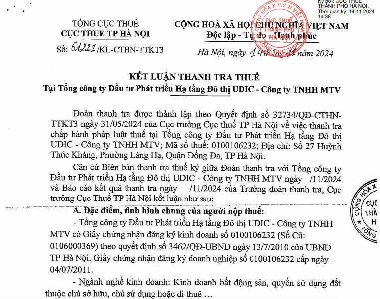 Cục Thuế TP Hà Nội vừa công bố kết luận thanh tra thuế tại Tổng công ty Đầu tư phát triển hạ tầng Đô thị UDIC – Công ty TNHH MTV (gọi tắt UDIC), địa chỉ tại số 27 Huỳnh Thúc Kháng, phường Láng Hạ, quận Đống Đa, Hà Nội.